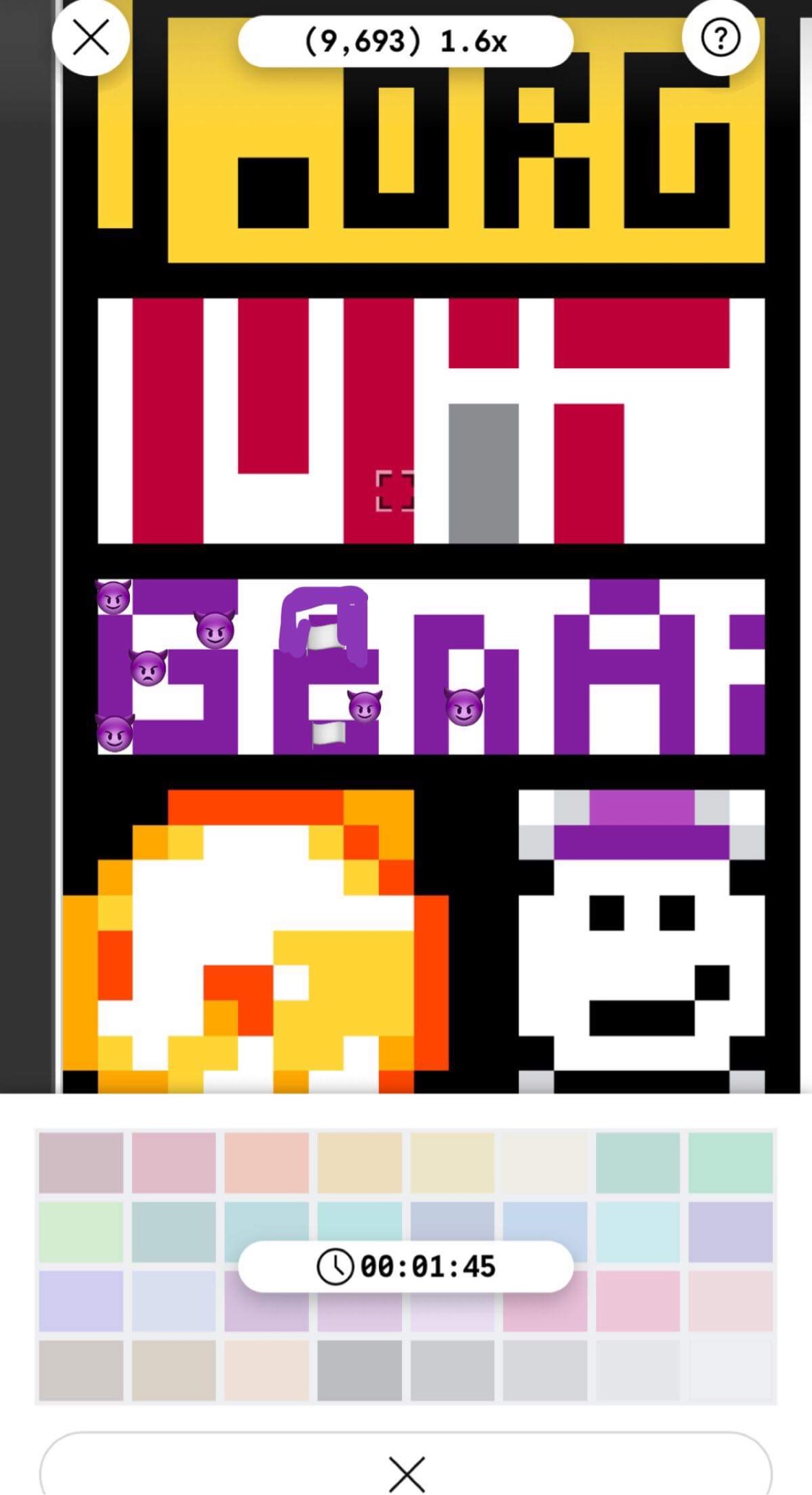 On commence par vouloir un joli fond violet, car c'est notre Barou-couleur. C'est avec l’œil larmoyant que nous posons le premier pixel, puis le second. Cependant, l'impensable survient : la première pierre à notre illustre édifice, est prestement retirée, suivie par la seconde. Notre dur labeur a été vain. Pute.