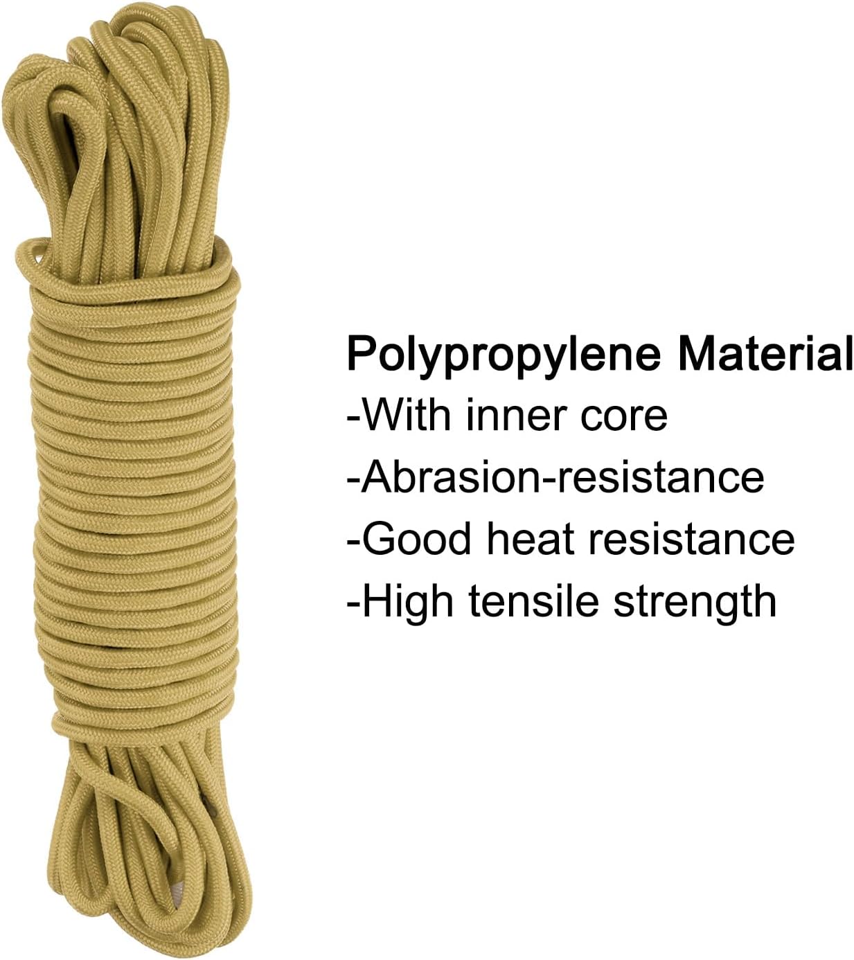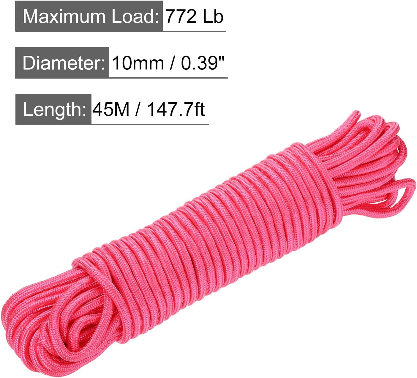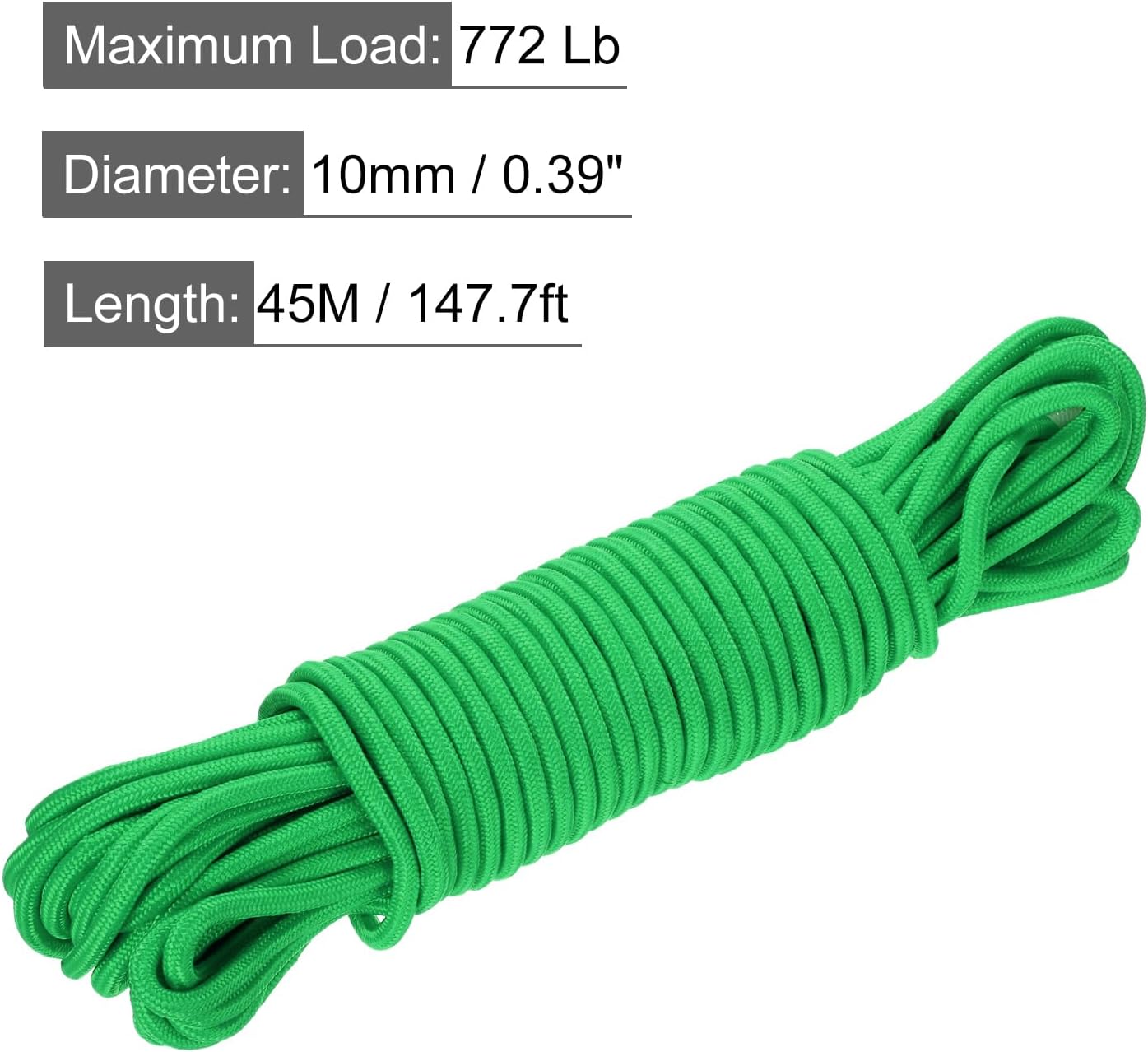 What is this?Braided polypropylene rope, for multi-purposes such as handicrafts, fixed goods, tie-down devices, marine needs, camping, swings, etc., The rope can withstand extreme temperatures, harsh weather, oil and abrasion, making it a more reliable accessory for indoor and outdoor use.What will I get?Pack of 1 Polypropylene Rope; Diameter: 10mm/0.39 inch; Length: 45M/147.7ft; Maximum Load: 772 Lb; Inner core: Polyester;Are there any advantages of the product?The rope is made of polypropylene, it will last long in the sun, and the sturdy braided construction keeps the PP rope nice and rounded. Abrasion-resistant, fade-resistant, oil-resistant, good heat resistance, with polyester fibre core, with high tensile strength and excellent knot retention for long service life.How to use it?Tie the rope to the projects that need to be connected and tie the knot easily.What should I notice?Tips: This rope cannot be used for rock climbing and rescue. According to the specifications and load performance of the rope, suitable for different needs.