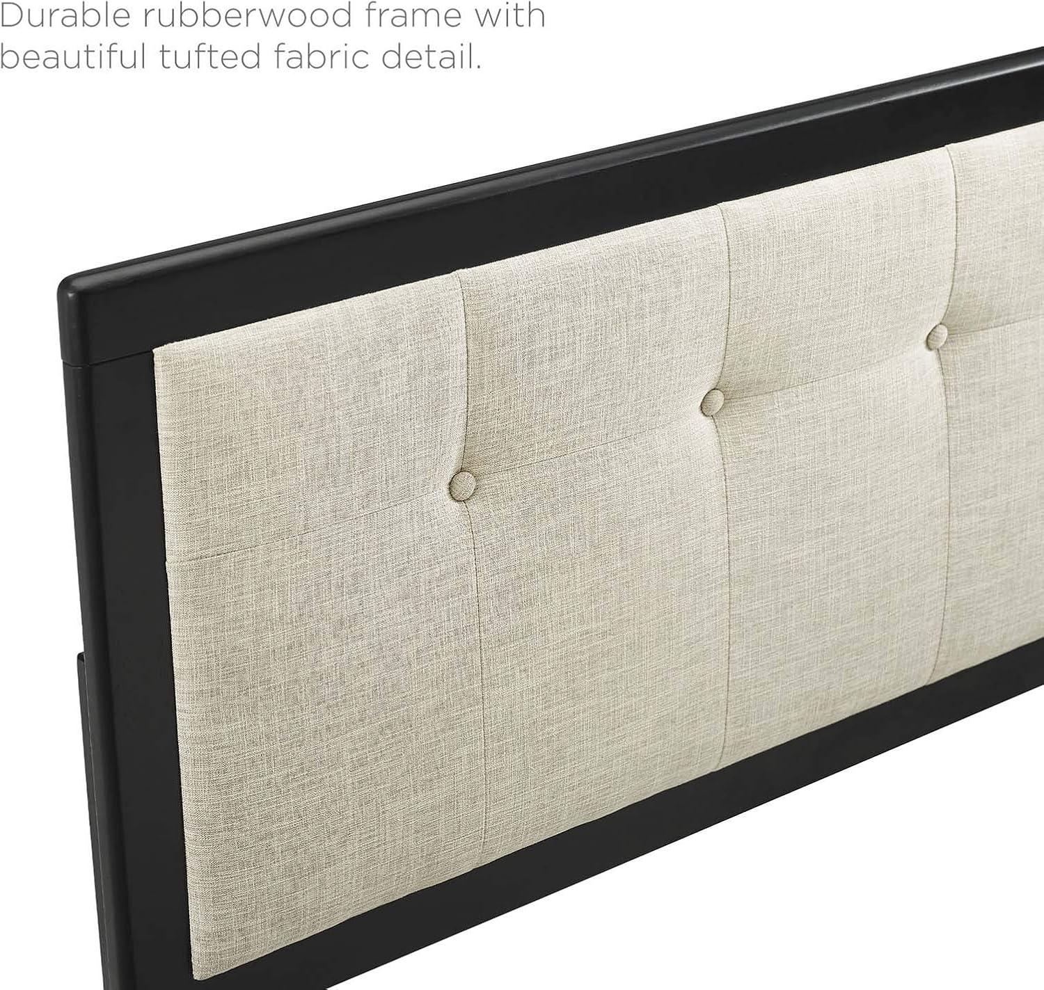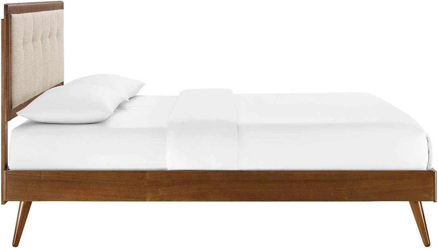 Refresh your master bedroom or guest room with the modern style, retro detail, and organic aesthetics of the Willow Tufted Wood Queen Platform Bed. Inspired by mid-century style, the upholstered headboard of this queen bed frame features a beautiful wood frame that encases a button tufted design. This platform bed frame is a sturdy addition to the bedroom with a durable wood, MDF, and veneer construction and splayed rubberwood legs. Eliminating the need for a box spring, this queen bed is complete with a wood slat support system, reinforced center beam, and supporting legs that make it a lasting mattress foundation for memory foam, latex, innerspring, and hybrid mattresses. Assembly required. Queen Bed Frame Weight Capacity: 601 lbs.