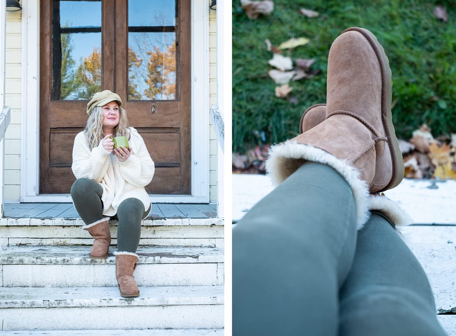 These sheepskin winter boots offer premium warmth and all-day comfort. They are crafted from a combination of water resistant, highest-grade natural Australian sheep suede on the outside and thick reverse shearling fur on the inside. Embellished with a toggle-button closure, this plush sheepskin boot is more versatile than ever – fasten for extra warmth, or fold down for a full, fluffy collar. The sole is made of lightly treaded soft and flexible rubber. The boot shaft height (which includes outer sole) is appoximately 10" tall. These boots come in a Chestnut brown color and we carry women's sizes 5 to 11. They fit the same as your regular shoe size. If you wear a half size, order the next size up (8 ½ order size 9).