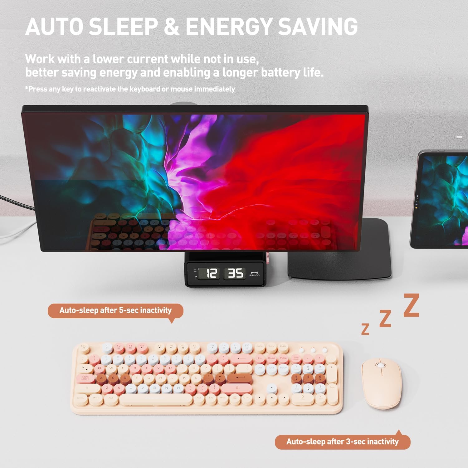 • 【 Wireless Keyboard Mouse Combo】The inspiration for these cute rounded keys comes from vintage typewriters offering you visual enjoyment and a retro feeling to type. With colorful key caps, make you be distinctive in the office and work full of fun.